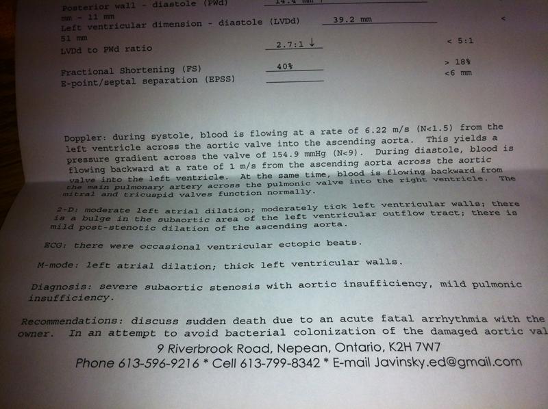 I am attaching the pages here (3 of them – there is an overlap from Page 1 to 2 – in order for my iPhone to capture all info. I had to break up the one page into two) for people to read. His official diagnois is: Severe Subaortic Stenosis with Aortic Insufficiency, Mild Pulmonic Insufficiency. 🙁