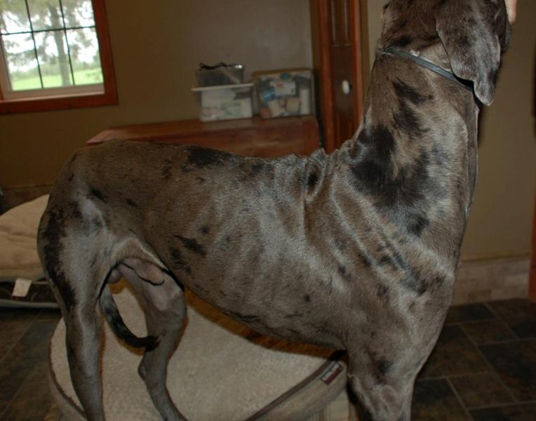 It is very hard to capture the emaciation on this boy. Some coat colours and patterns are much harder to capture. He is very skinny. Weight about 95 pounds or so.