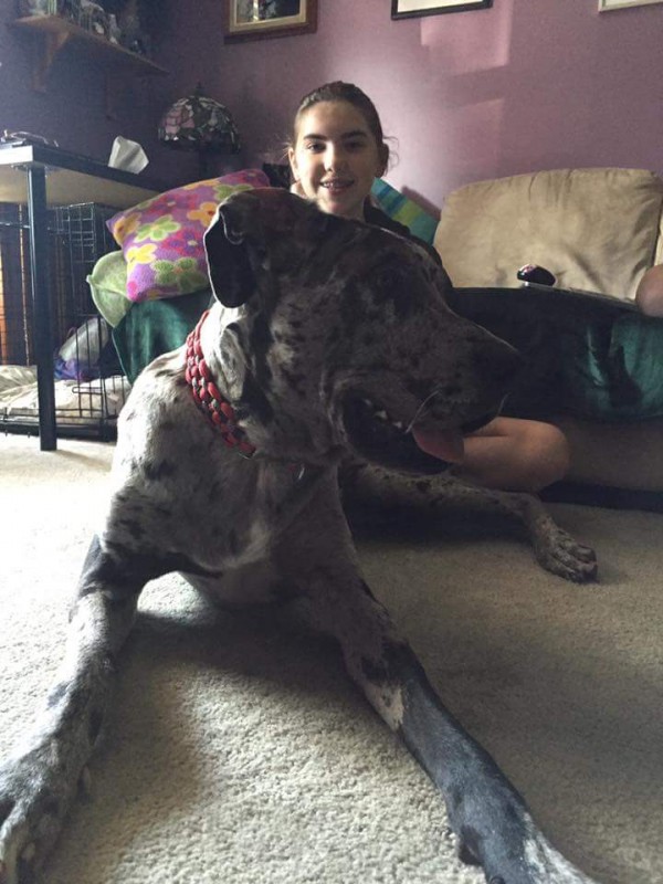 “Baby Kaos has settled in pretty good. He does self regulate in his play with Sally and right now, he is enjoying an ice cube on the Dane bed in the living room while Sally watches. He is very curious about Sally and constantly engages in play with her. When she misses his play bow, Kaos thinks it is perfectly acceptable to paw her. He has gotten lots of love and rubs so far. He is not one to sit still or lay down for too long. He is constantly exploring the main floor of the house. Our neighbours were taken with him and marveled at his affectionate nature.”