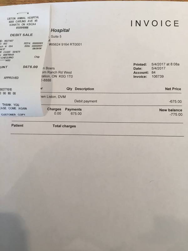 If anyone else would consider his cause, you can donate direct to Liston Animal Hospital – Rebecca would be so happy to assist you – 613-591-0966