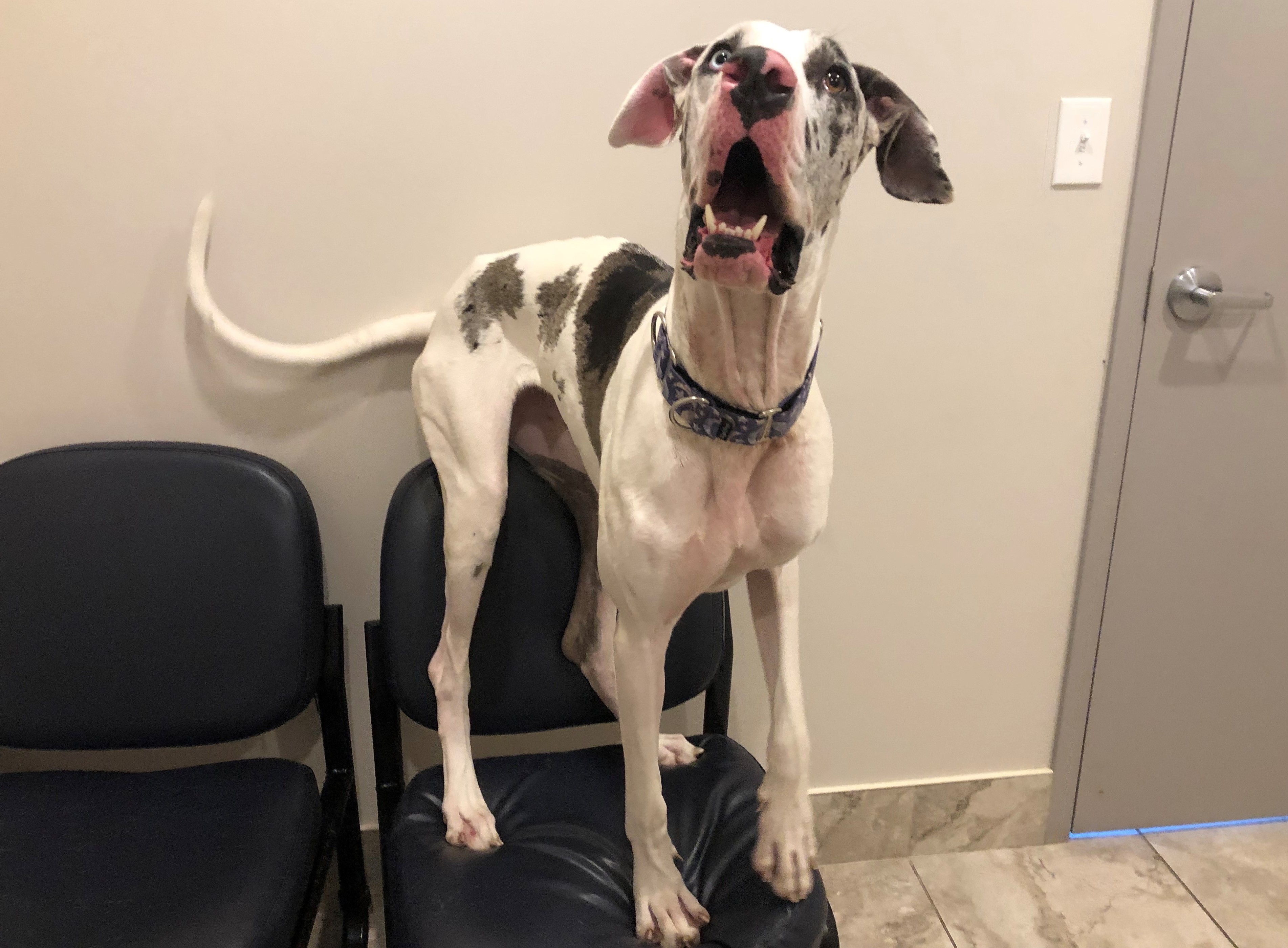 This is Miss Lily when the Vet visit was over and she notes a large pic of a dog on the wall!