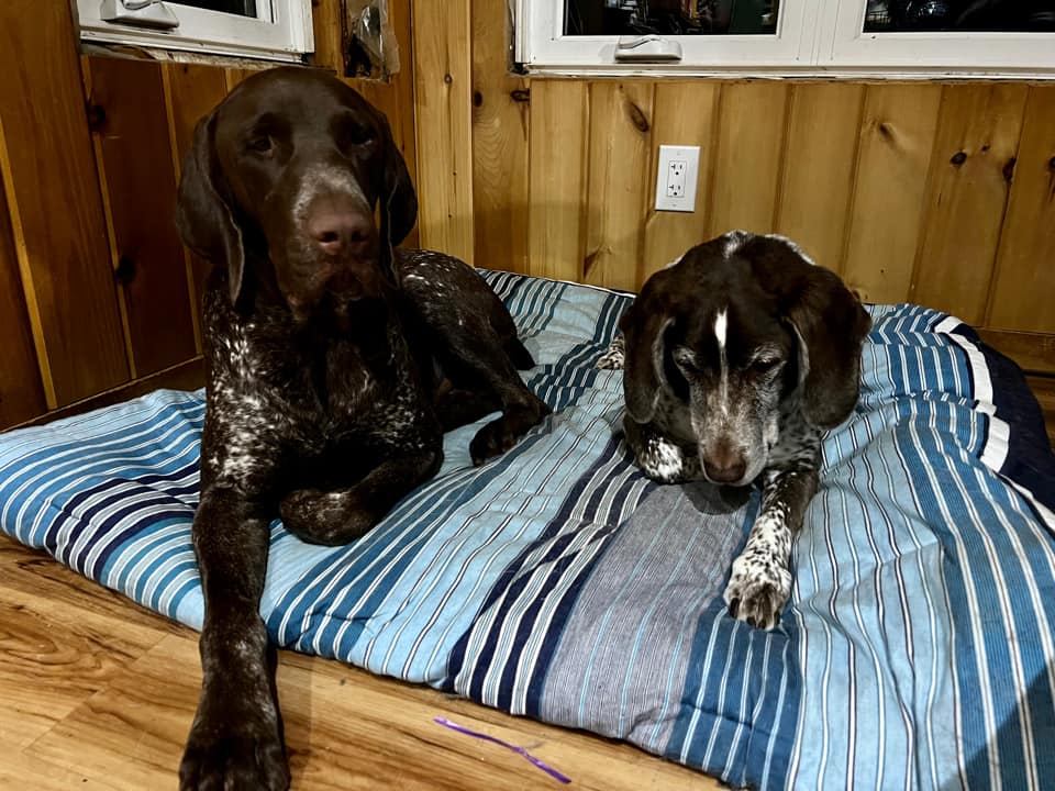 Sep 12022 AND GSPs hang out together too! Our 2.5+-year-old GSP Tango with Mr. James. Mr. James is trying to stay awake! He is literally nodding off & my pic is a bit dark as I turned almost all the lights off so he could doze….
