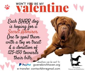 Thank you to everyone who has become a Valentine Angel to date, and to those asking, here is our email transfer address to send the vet bill part of your generous donation: contactbhrr@gmail.com