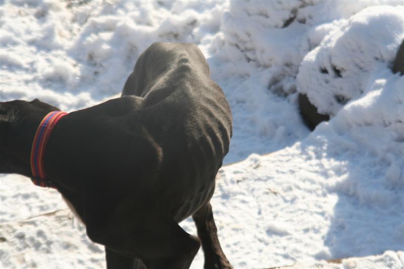 I took Dana with me to the Vet last night and she weighed 29.2 KGs(64.24 pounds). Picture from yesterday posted below and it really does not do her justice with how thin she really is. 😥 The vet also agreed that she is no more than 8 months old and between the Vet and I we were able to get into her mouth better(wiggle worm monkey she is) and we could better see that she has no tartar on her teeth and even is still erupting teeth SO she is somewhere between 6.5 months – 8 months of age. The Vet looked at her tail and also felt that she has had several breaks and that they have healed in a not so nice fashion. She saw the bald and callused areas and the raw areas and we are going to use Cothivet on her tail plus between her toes(it remains to be seen if the rawness between her toes is from being on the roads, a rash or from trying to get out of the kennel at the shelter or even from escaping her crate at the foster home and our own home the first night). She has such a long tail and is very ‘happy’ with it. She just bangs and bangs it even at our house in her crate when it is time to take her out. She is better about ‘waiting’ for me to get her out yet that little body is so happy to come out after eating to be with everyone. We drew blood to run a HWT even though we have a good grasp on her current age and the incubation period of HW etc. JUST in case. She took treats really gently from the Vet and honestly, except for one moment of her trying to climb in the front as I was driving down our laneway; she layed down and snored and had dreams the whole drive in. PHEWWW! She is a terrible jumper and I know that I am going to have my share of black eyes, fat lips and broken glasses before we get the upper hand on that behavour. Her heart is great and her lungs sound clear. Dana really was happy to see everyone that was there at the hospital and sat on the scale long enough to get a weight. GOOD girl! Her leash manners were really not bad, considering and at times were actually quite good. She is a puller most of the time though and a weaver! We will see what her fecal results will bring. Tonight will be her third night of de-worming with the Panacur. Her poor coat while so soft is smelly and flaky and until the weather is better and she is stronger(she is quite weak); I am not going to bath her. The Vet’s words words were ‘eat, eat and eat!’ The Vet and I both hope that with the Ester C and proper nutrition(great food and enough of it) that we can ‘lift’ her up on her toes better for those feet are really really really bad and her knees, they could just about make you cry they are so terrible right now. Yet, even today, she did some puppy romping on her gangly deer legs. The Vet thought she was very social and friendly and a nice girl! I have to say that something changed with this girl yesterday afternoon; she just ‘relaxed’ and went into her crate of her own volition and slept soundly. Last night(or rather in the wee hours of this AM); I took her out one more time and she went very willingly into her crate with a treat(I owe Maggi a Pig’s ear that I snagged out of her SS bag for Dana….. 😳 ) and she slept right though, no wailing, crying, trying to get out of her crate, NOTHING. I woke her up at 7:00 AM to get her out and fed….WOW! WOW! WOW! I did not think we would get to that point that soon and man, is she smart. She is not the shrinking violet kind of gal and will most certainly need to go to a home with experience. I already know that I am going to adore this one to wee bits and she is another very special creature! Our Leader Female Kona(almost 10 now) also did something very interesting last night when Dana was sleeping in her crate; she went into the crate(NEVER does this) and layed down and let Dana put her head on her back and hips(Kona has bad HD and this was very revealing) and slept there. She was definitely passing along a message about Dana to us and I am looking forward to properly understanding what that message is through time. Kona watches over our kids like her own, she is the best leader female one could ask for and to see this behavour; is fascinating. Animal dynamics and behavour is so incredible. Even to see Dana be ‘ok’ with a dog going into her crate was interesting. Yes, Dana has some little resourcing going on…..more like mild protection in my opinion for she has lip curled when I was preparing food for Tain and did the same when a dog went to go over to the couch to see Sean yet we have nipped this in the bud very fast and other than 3 moments like this; she has been totally ‘kewl’ with things. Even late this afternoon when preparing her next meal; she did not get stressed(that is where this behavour is coming from as she is so starved for attention/love and food) and stood there with other dogs mingling around. We are watching it and correcting the behavour and in time as Dana learns that she is going to be fed and it is going to be consistent etc., this will fade. Lil Linus had this behavour as well at 14 weeks of age when he arrived and much much much worse than Dana and he is a great boy. This is not an uncommon behavour to see in dogs with this history and our patience and understanding along with the continued correction on proper behavour with her being fed regularly etc. is going to work wonders. In respect to the attention and love; we do not overdue it and she is learning she has to ‘share’. She will continue to be fed in her crate for her safety and to not be set up for failure and while I can give her little treats around the other dogs; I will not give her a high value item outside of her crate at this time either. She has been fully integrated with everyone and even this AM, she had a few seconds of play! YAY! YAY! with Porridge and a Client’s Dog before she tired and had to lie down. She was not quite sure how to go about doing it yet she did do some mouthing back with them and a little bounce here