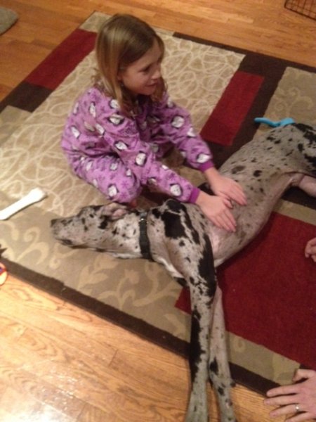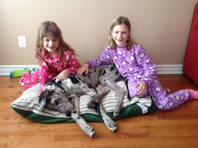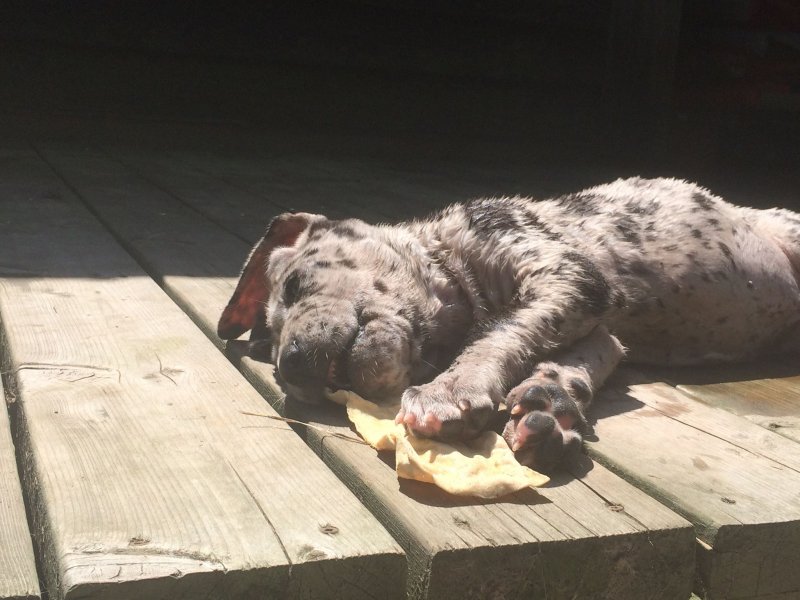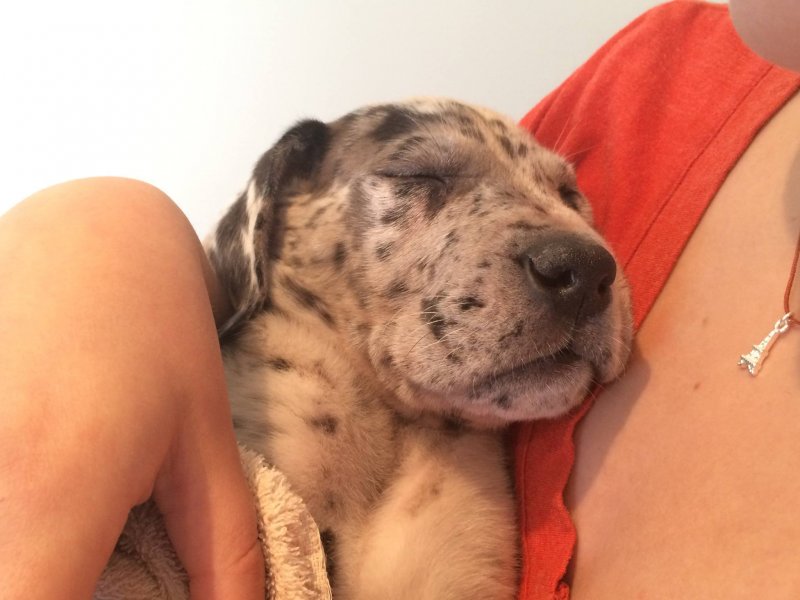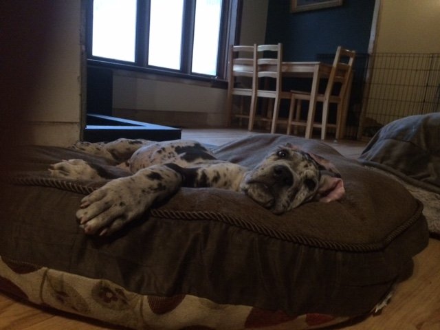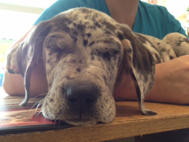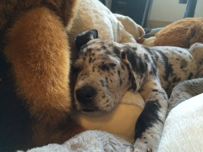 BHRR’s Kaos(7 weeks) snuggling in for a nap with one of my own Great Danes, ‘Salt'(13 weeks) after dinner……