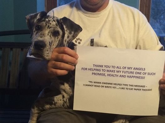 On Thursday July 16th, I received an urgent request to assist a 6 week old GD that was originally suspected as having a fractured knee, then it was suspected that he could have septic arthritis and, we stepped up without hesitation to assist as the special needs are our focus/specialty and, I paid personally for his Vet Bills at one Hospital, $249.43. He had been brought in to be put to sleep.