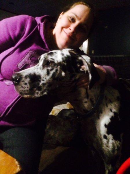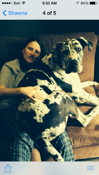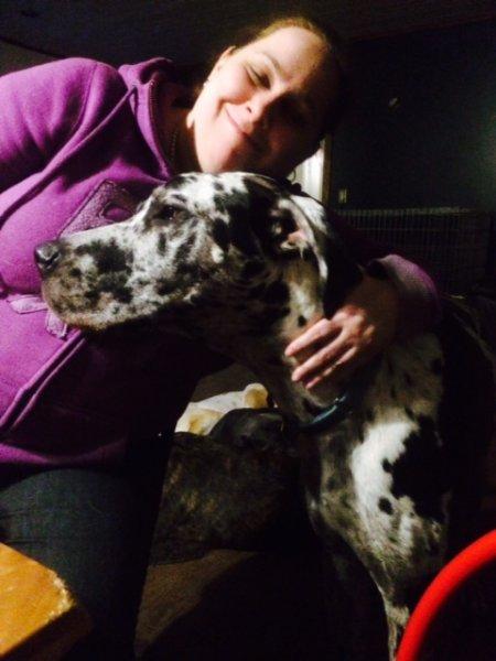 "I have this 1 yr old unfixed male dane. He was surrendered because the guy didn't have time for him. Very good with other dogs, a bit growly with people–not to be aggressive-it's more insecurity I think. He is being walked by our volunteers. I tested for food and he did lift his lip but no growling and I could take the food from him. He has very little manners and is very strong-difficult to walk. He definitely needs experienced people. Do you think Gwen would be interested?"