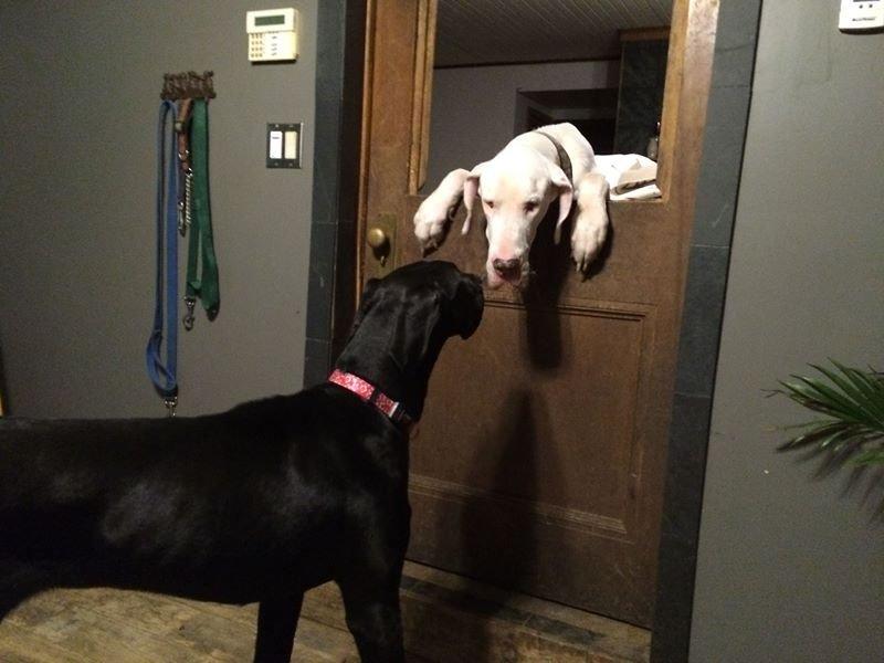 What is extremely special about this photo is that the Dane greeting her(now has had his own nails nicely trimmed short as of last night!  ) is my own piece of 'Ivy'. That is one of my DEAF Danes, Drift.