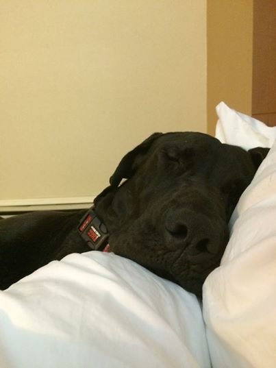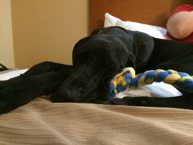 than some initial whining and barking, has settled down for a nap.