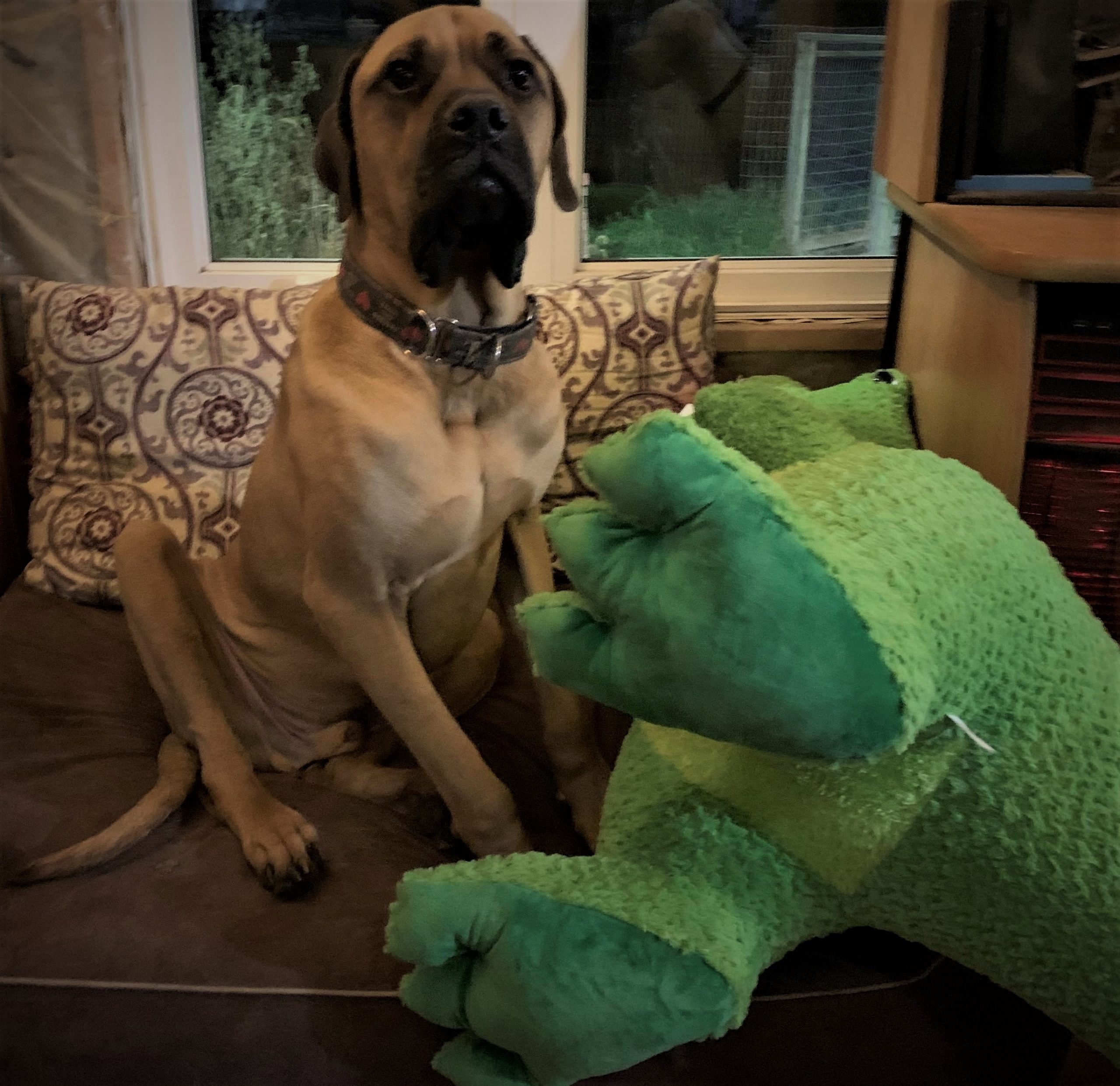 While we wait for Mr. Bear to come back – ETA Friday (please come soon!) – to BHRR’s Symba, this same kind angel that took the ICKY and I mean ICKY Mr. Bear to wash – and put him through the washer twice! – so generously gave him a jumbo Mr. Dino Stuffie.