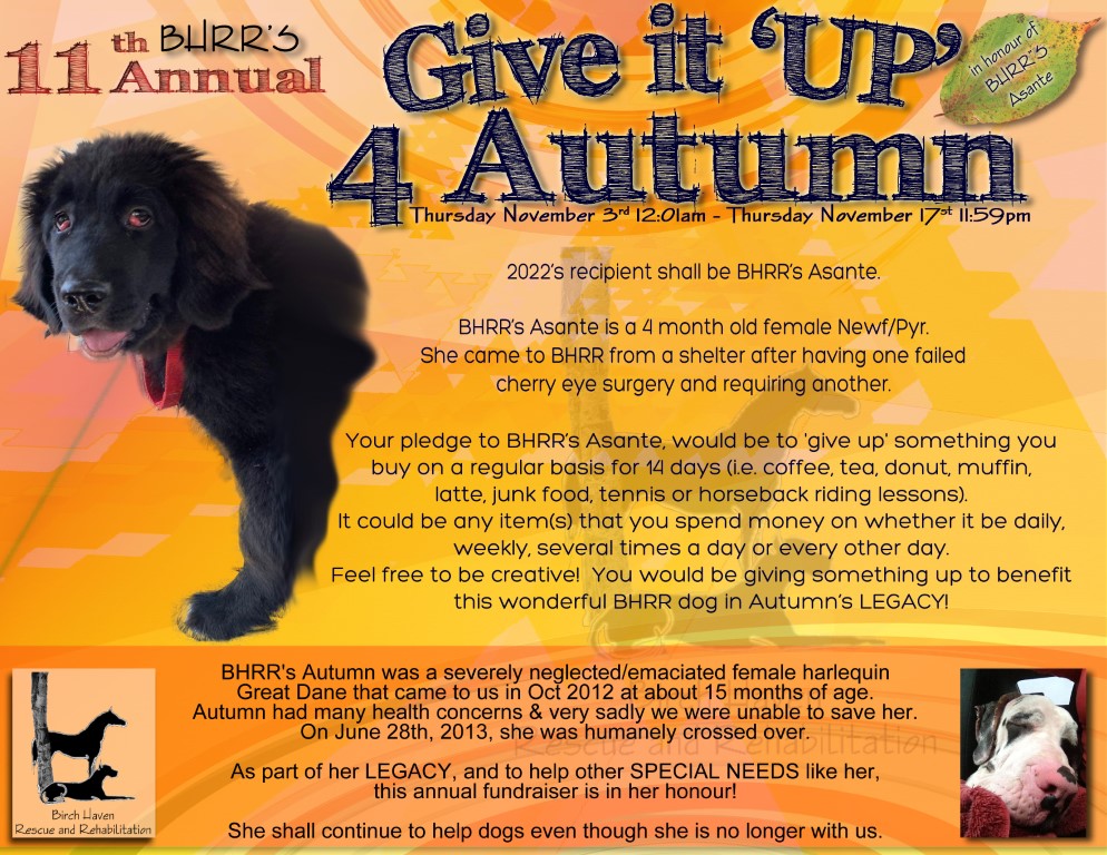 Oct 172022 In 2022, BHRR’s Asante shall be the recipient of our 11th Annual Give it “UP’ 4 Autumn Fundraiser!