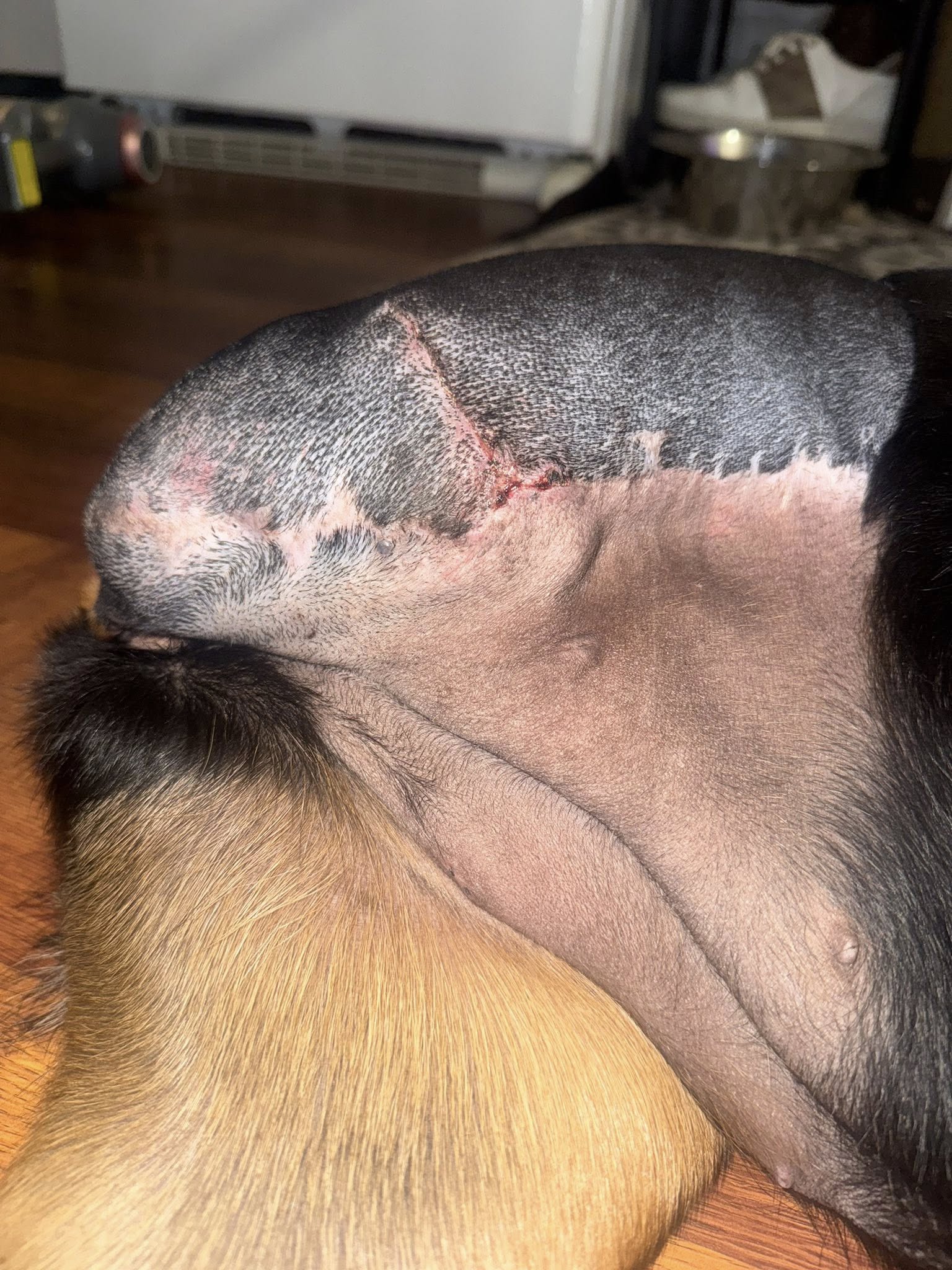 Weight: ~ 34.9 kgs(December 2025) 76.8 pounds. We want to keep her lean/muscled and fit. Becoming fat is NOT in her or any dog’s best interest. She is also a tripod. We have asked his lovely foster home to cut back on her food /.treats.