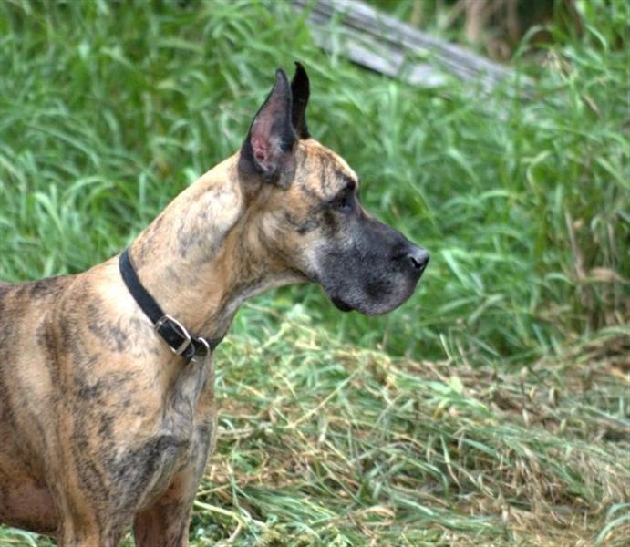 BHRR’s Mazda – Female Brindle Great Dane, cropped ears, utd on shots, approximately 1< years of age and not yet spayed. (April 2005). We are told that she is not housetrained. We will get a better approximate on age and her health situation when she arrives. We have been told that she was seen thrown out of a moving vehicle a week+ ago. She will be arriving April 16th.