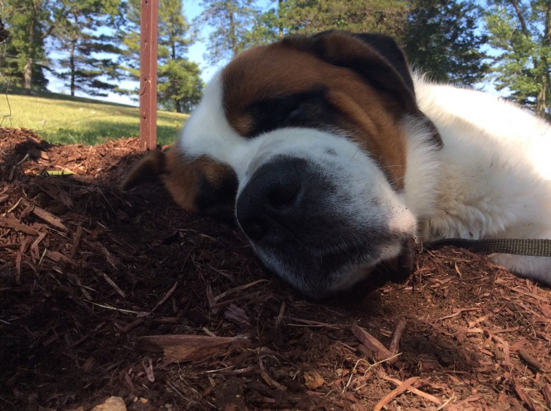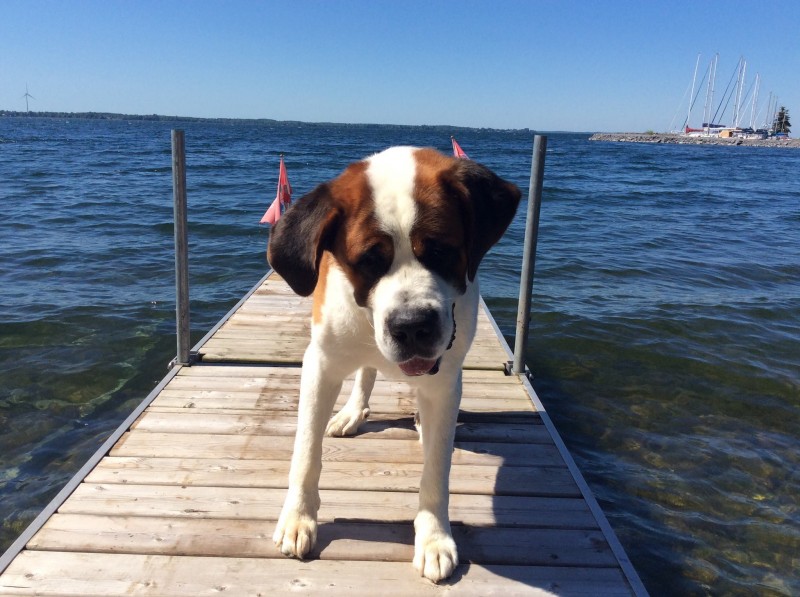 I have heard that he has already been in the lake at Judy’s and seems to know what the king size bed is for!