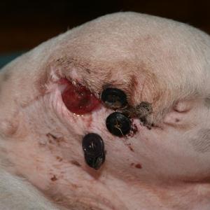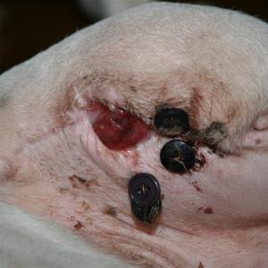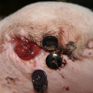 Gwen – take a look at these for me. Cleaned Potter’s leg last night and it looked fine. Check it this morning and it appears the buttons have let loose – that is the stump of the bone you see in the picture. The skin is not loose – it is actually healed around the bone.